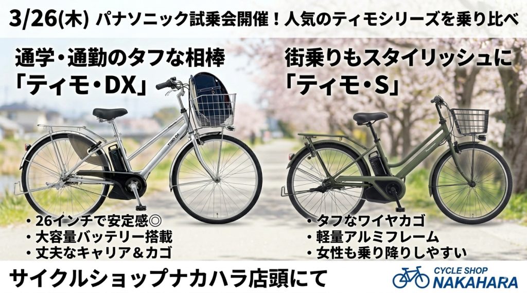 新生活を控え、自転車を新調しようとお考えの方も多いのではないでしょうか。特に学生や通勤・通学層に人気の高いパナソニックの「ティモ」シリーズ、今回の試乗会ではその「DX」と「S」を乗り比べできます!